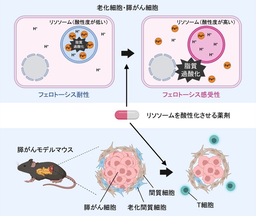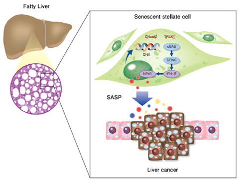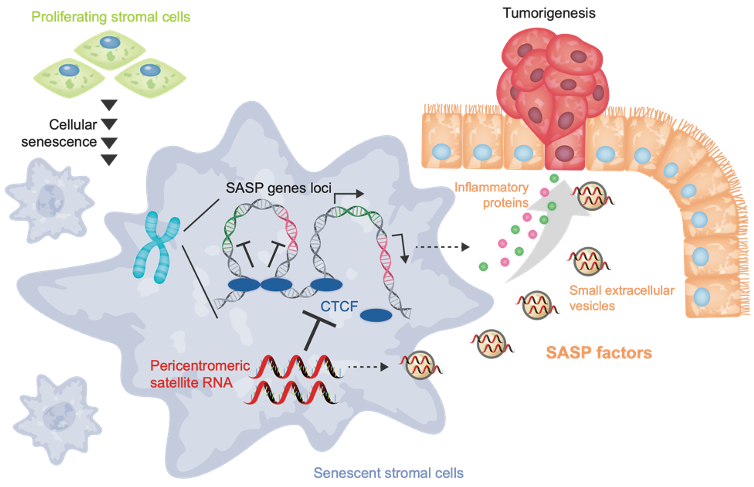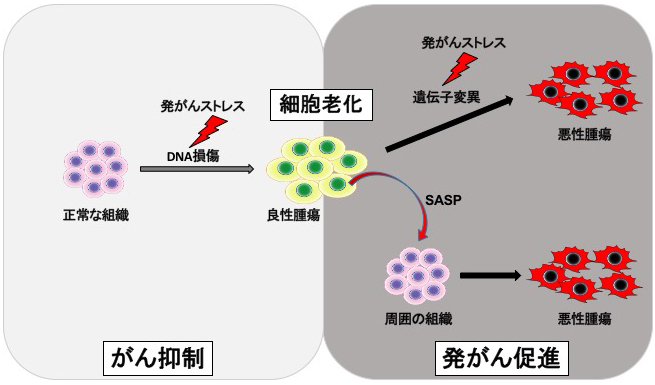 私たちの体を構成する細胞は加齢と伴に「細胞老化」をおこします。 細胞が老化する原因はあらゆるストレスであり、細胞老化がおこると細胞の増殖は不可逆的に停止します(Takahashi et al., Nat Cell Biol, 2006: Imai et al., Cell Rep, 2014)。 がん遺伝子の活性化や酸化的ストレスなどの発がんストレスも細胞老化を引き起こす原因の一つであり(Takahashi, , Nat Rev MCB, 2024)、近年では抗がん剤や放射線などのがんの治療やウイルス感染も細胞老化を促進することが知られています(Yamauchi et al., J Biochem, 2025)。私たちは、個体老化や肥満などのストレスによって老化細胞が体内に蓄積してゆくことを 老化細胞イメージングマウスや老化細胞特異的酵素活性プローブを用いた研究で明らかにしてきました(Yamakoshi & Takahashi et al., JCB, 2009; Tanaka et al., Cancer Sci, 2024)。細胞老化は生体内で異常な細胞の増殖を止めるがん抑制機構として働く一方で、発がんを促進する負の側面があることもわかってきました(Loo et al., Cancer Sci, 2020)。